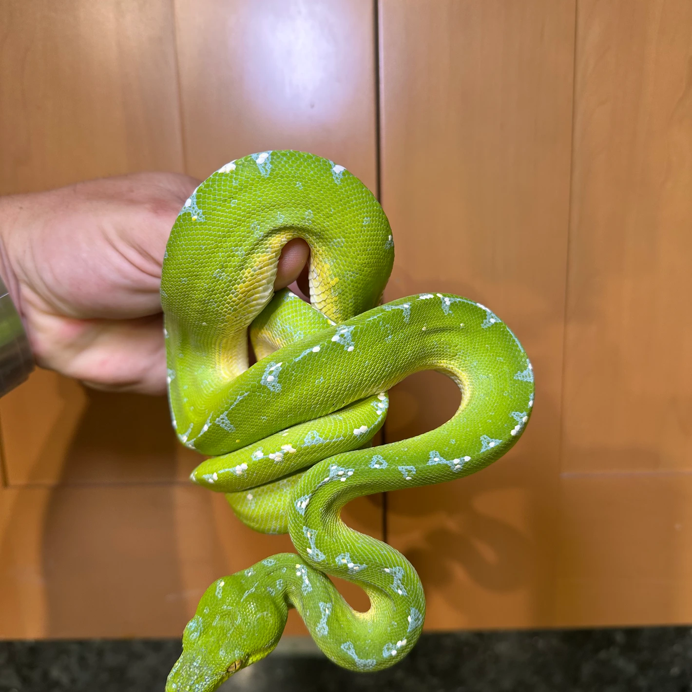 Neugeborene Grüne Baumpythons sind leuchtend gelb, orange oder ziegelrot und entwickeln ihre grüne Färbung erst nach 6–8 Monaten.